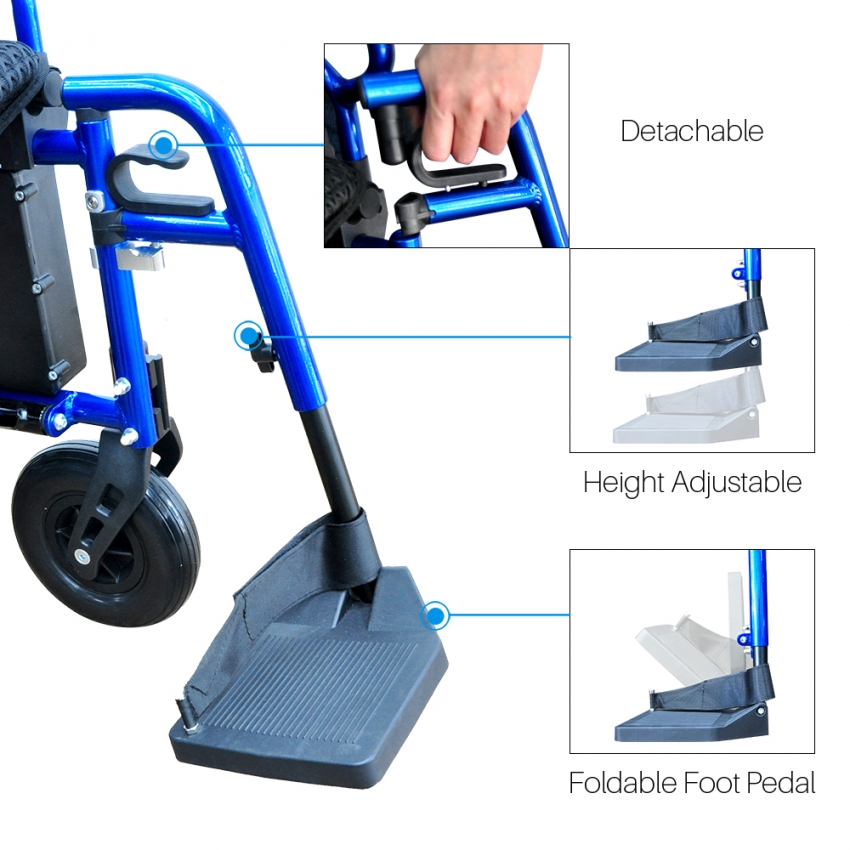 - The Footrests are height adjustable to suit users with different leg lengths, at the same time, furthermore, they are foldable and detachable for easy access or storage.
