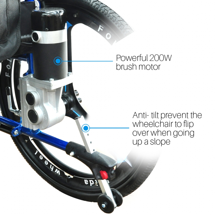 - The stylish 24″ rear wheels are made of Magnesium Alloy in order to ensure good strength and solid pneumatic tires.